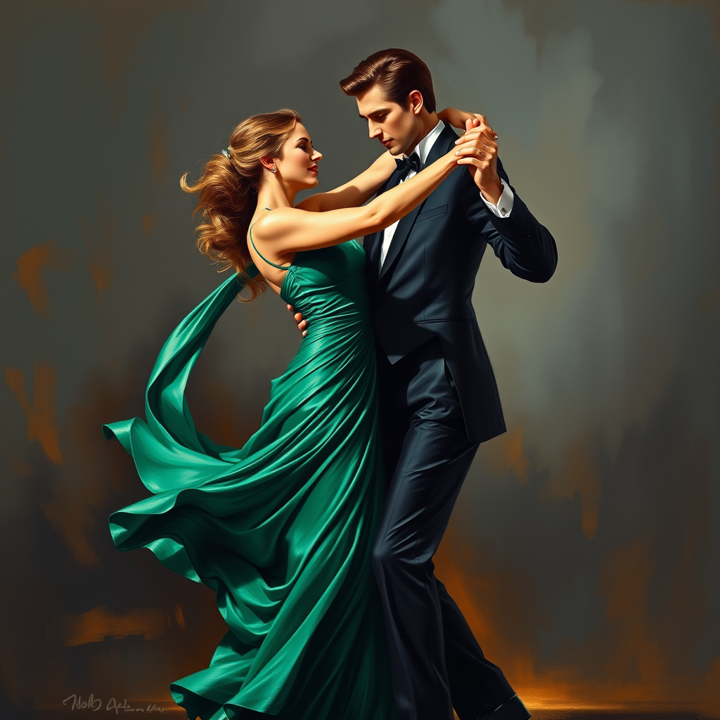 An oil painting depicts a man and woman passionately dancing the tango, their movements exuding grace and intensity. The woman is dressed in a striking emerald green gown, its fabric flowing with every step, while the man is in a classic black tuxedo. The background is a deep charcoal gray, enhancing the scene's aura of mystery and allure. The couple's expressions are focused and intense, conveying the depth of their connection. The hint of dim, golden lighting adds a touch of warmth and drama to the setting, highlighting the elegance and emotion of their dance.