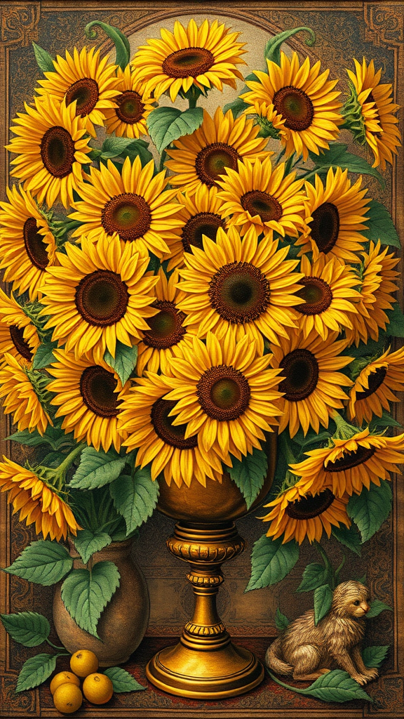 An oil painting of a multitude of sunflowers in a golden chalice, reminiscent of medieval manuscripts from 1000-1400 CE, in vibrant 32k UHD quality, capturing the essence of a richly colorized tapestry, exhibiting the intricate detail and dynamic scenes typically found in Simon Prades' eye-catching, wimmelbilder style with a subtle grainy texture, and an elongated aspect ratio of 35:46, featuring an elevated level of stylization with hints of symbolic and mythical elements woven into the composition.