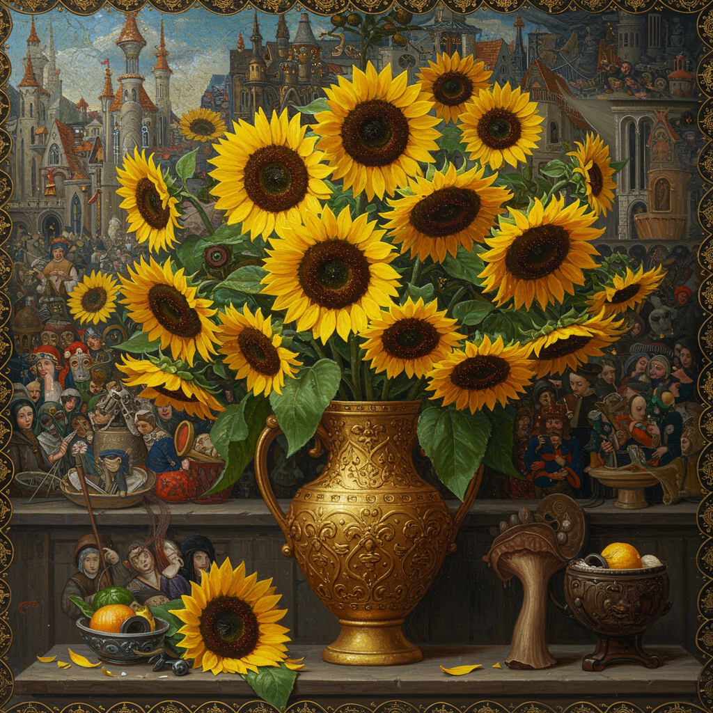 An oil painting portraying a plethora of sunflowers arranged in an ornate, golden-hued vase, designed in the style reminiscent of medieval European art from 1000–1400 CE. The scene is depicted in striking 32k ultra-high-definition resolution, enriched with vibrant colors that bring the composition to life. The artwork echoes the intricate detailing of Simon Prades, with an eye-catching amalgamation of elements that draw viewers in. The painting features a wimmelbilder style, filled with intricate, bustling details, and is rendered with a vintage, grainy texture to evoke a sense of timelessness. The aspect ratio is elongated, enhancing the grandeur of the piece, while a sense of stylized creativity is evident throughout, adding a modern twist to the ancient inspiration.