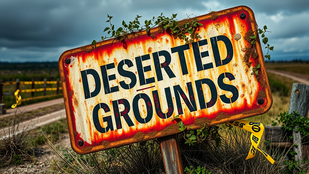 An old, rusting metal sign stands crookedly at the crossroads, its once vibrant colors now faded and peeling under years of harsh sun and relentless rain. The words "Deserted Grounds" are scrawled across it in bold, weather-beaten lettering, accompanied by jagged edges and bullet holes that hint at past violence. Wild vines and thick moss creep over its surface, partially obscuring the grim warning. Nearby, tattered remnants of caution tape flutter weakly in the breeze, adding an eerie sense of desolation to the foreboding landscape beyond.