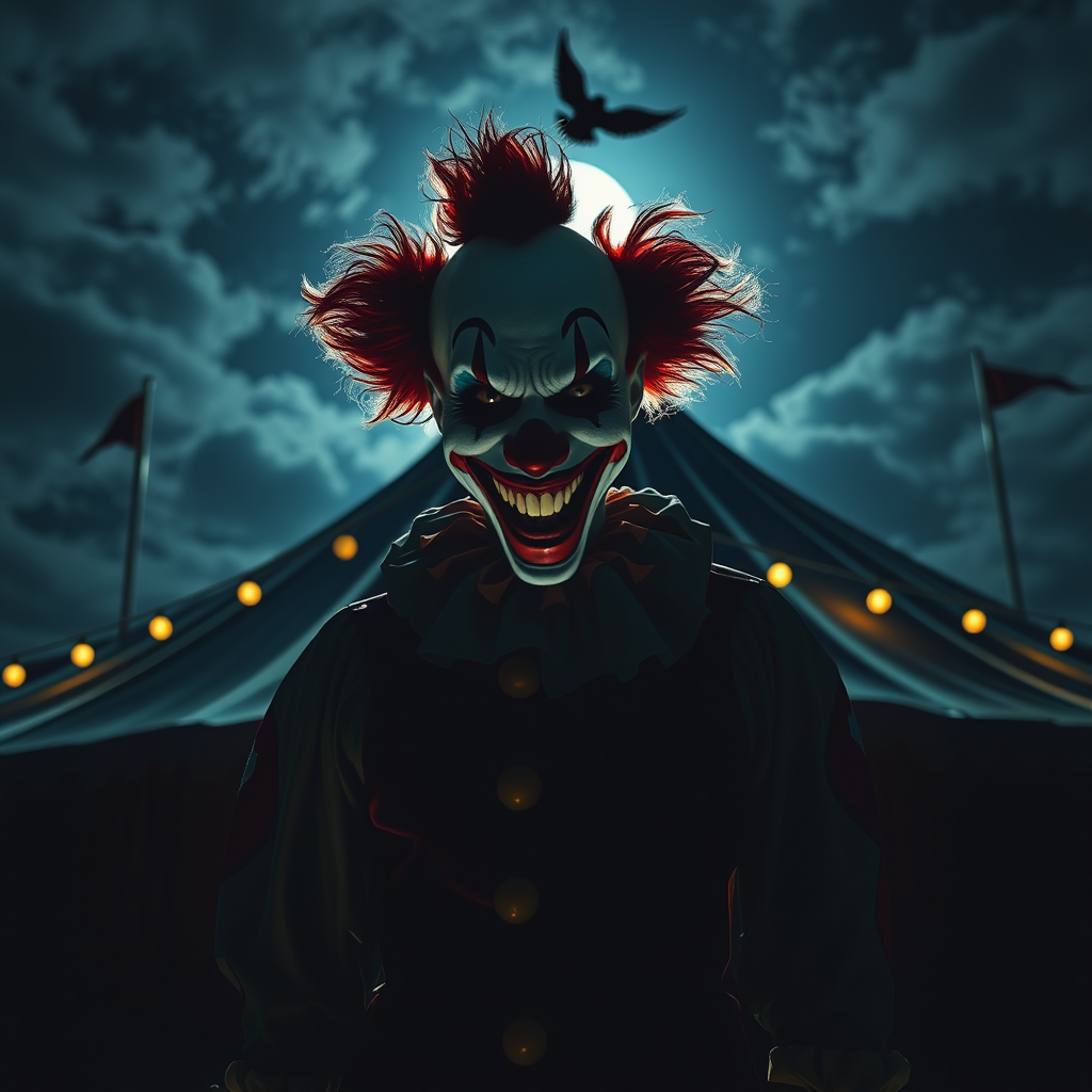 An ominous clown with a sinister grin stands menacingly before the shadowy circus tent under the moonlit sky, the scene captured in a high-resolution, realistic style resembling professional photography; the composition features a dramatic cinematic angle with dynamic backlighting casting eerie shadows, the clown's colorful attire contrasting starkly with the darkness surrounding him.