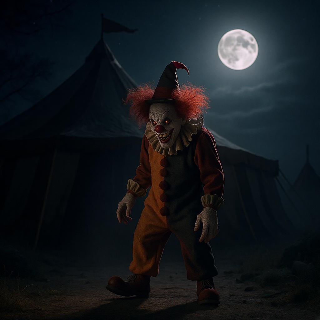 An ominous clown with a sinister grin stands menacingly in front of the old circus tent under a moonlit night sky, captured in high-resolution with an ultra-realistic quality. The professional photography showcases a cinematic angle, with dramatic lighting casting an eerie glow from behind, highlighting the clown's wild hair and vibrant costume, and casting long shadows that stretch across the ground.