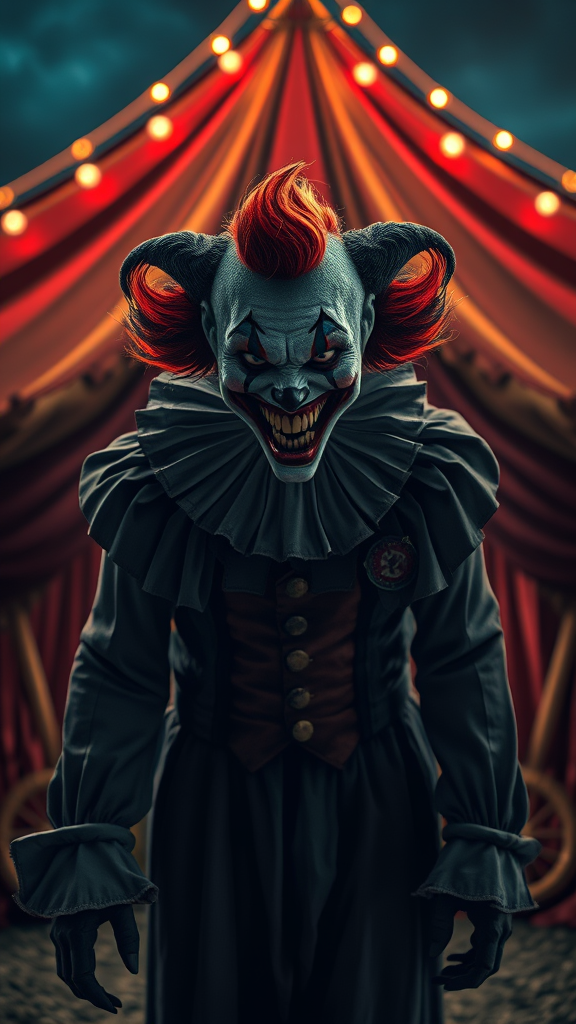 An ominous clown with darkly painted features looming menacingly before the entrance of a circus tent under the cloak of night, captured in high resolution with a touch of hyper-realism, expertly photographed from a dramatic angle, accentuated by dynamic lighting that casts an eerie glow from behind.