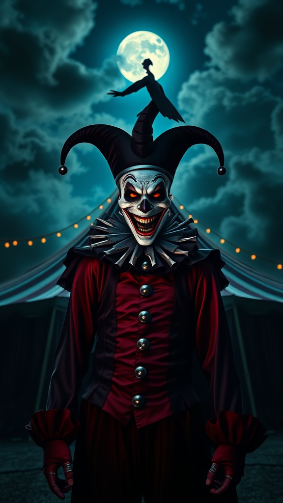 An ominous jester with a sinister grin stands before the looming circus tent under the moonlit sky, captured in high-resolution with a professional touch, showcasing a cinematic angle and dynamic, eerie backlighting that casts long shadows across the scene.
