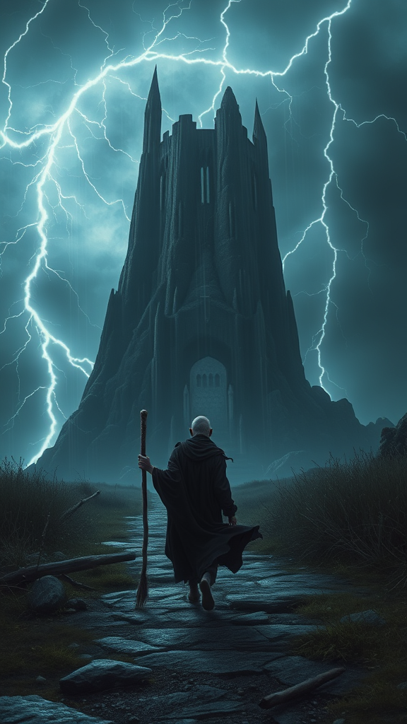 An ominous night unfolds as a gaunt, frail wizard, his figure thin and sickly, strides purposefully toward a looming dark tower. Clad in flowing black robes, he grips a gnarled staff, each step echoing in the silence. The sky crackles with lightning, casting an eerie glow across the landscape. Shimmering rays of mystical light dance amidst the storm, illuminating the path as if guided by ancient magic. This scene evokes the world of Dungeons and Dragons, reminiscent of the dynamic artistry of Doug Beekman and Jaime Jones, captured in breathtaking 8k, ultra-high detail.