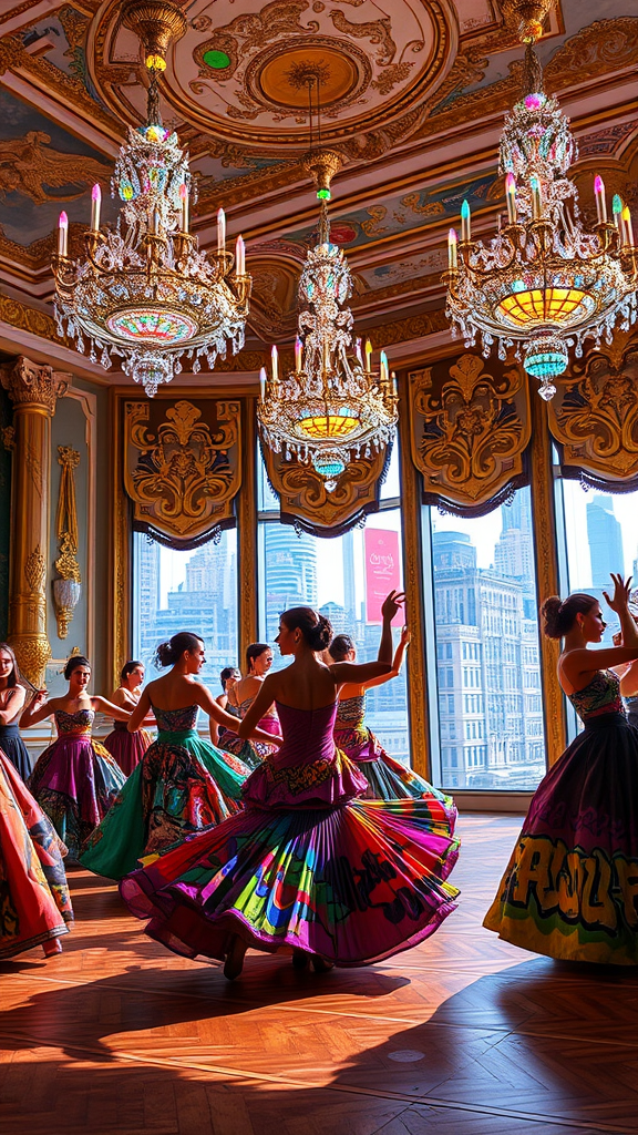 An opulent rococo ballroom where the grandeur of the 18th century meets the boldness of urban graffiti, with dancers adorned in extravagant silk gowns painted with modern street art motifs; the crystal chandeliers are holographic, casting vibrant, ever-changing colors, much like a kaleidoscope. In the background, symphonic music fuses with hip-hop beats, and the walls are animated with intricate baroque patterns that pulse to the rhythm, creating a dynamic interplay between history and modernity. Outside, a glimpse of a bustling futuristic city skyline is visible through large windows, hinting at the convergence of past elegance and future innovation.