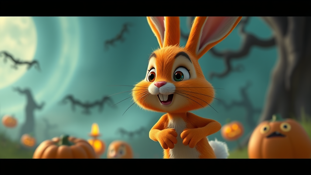An orange bunny embarks on a spooky yet hilarious adventure in a vibrant, animated Pixar-style film, blending humor and thrills in a whimsical tale.