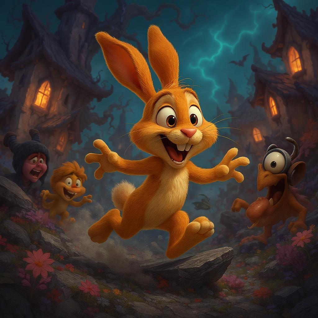 "An orange bunny navigates a Pixar-inspired world, blending elements of humor and fright as it embarks on a thrilling adventure filled with quirky, amusing characters and unexpected spooky moments."