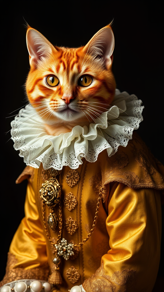 An orange tabby cat in a lush renaissance ensemble, adorned with an elegant ruff collar and an opulent golden robe, strikes a noble pose in a studio portrait. The costume features intricate embroidery and ornate jewelry that highlight the cat's regal presence. Set against a dark backdrop, the scene showcases a sharp focus on historical fashion, with rich textures and an air of aristocratic grace. The cat's eyes gleam with a dignified intelligence, perfectly complementing its majestic attire.