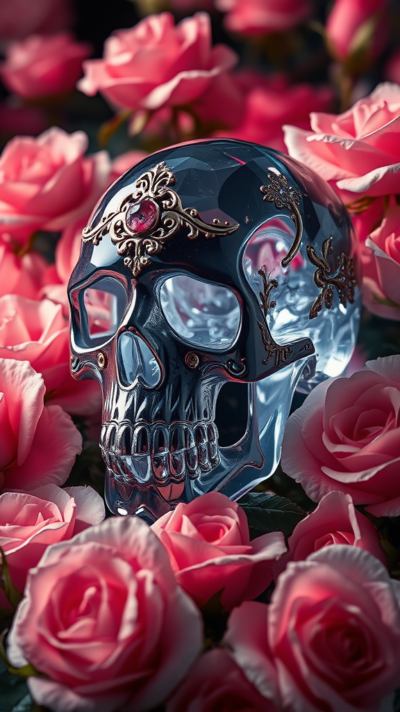 An ornate crystal skull nestled amidst a sea of blooming roses, exuding a dark fantasy allure with an ethereal and magical aura. The scene is illuminated by dramatic, cinematic lighting, capturing every intricate detail in spectacular UHD and HDR quality. The atmosphere is akin to the imaginative world of Brian Froud, blending rich textures and vivid colors to create an epic, otherworldly vision. The skull refracts light into mesmerizing patterns, casting shimmering reflections over the roses, each petal showcasing meticulous detail. The overall composition promises an enchanting and immersive experience, perfect for a wallpaper, where fantasy art meets high-definition brilliance.