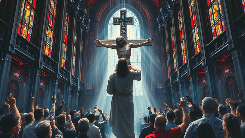 An out-of-this-world impressionist oil painting depicts an awe-inspiring cyber Christ with intricate, futuristic cybernetic implants hanging from a techno cross. He faces an exultant congregation of believers, hands raised in worship, inside a vast futuristic techno cathedral. The scene is futuristic, ceremonial, and grandiose, blending cyberpunk and neo-futuristic elements. A dark ambiance prevails, with dramatic, cinematic lighting and light rays streaming through tall stained glass windows, creating a volume lighting effect. The ultra-wide shot captures the depth of the scene with a distinctive impressionist style reminiscent of Claude Monet. The painting evokes the concept of technology as humanity's new faith, illustrating devotees in adoration at the altar of a techno Christ. The artwork maintains a rich, detailed composition, free from any extraneous elements such as wings, mockups, or signatures, ensuring a focus on its thematic essence.