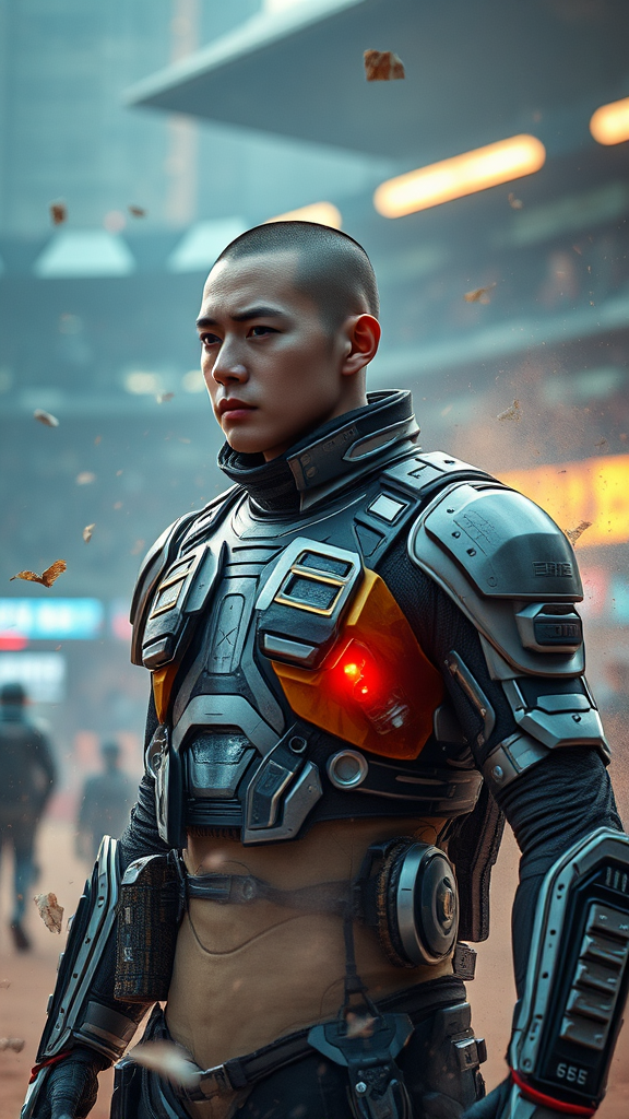 An outdoor arena scene reveals a futuristic battleground where an Asian cyberpunk soldier, inspired by Wu Jing, stands amidst a whirlwind of wind currents that subtly lift debris and dust around him. The soldier sports a sleek, shaved head, reflecting the shimmering neon lights that punctuate the dystopian atmosphere. His armor is a fusion of advanced tech and urban camouflage, blending seamlessly with the metallic and urban landscape of the cyberpunk world. The vertical composition enhances the dynamic energy and tension of the scene.