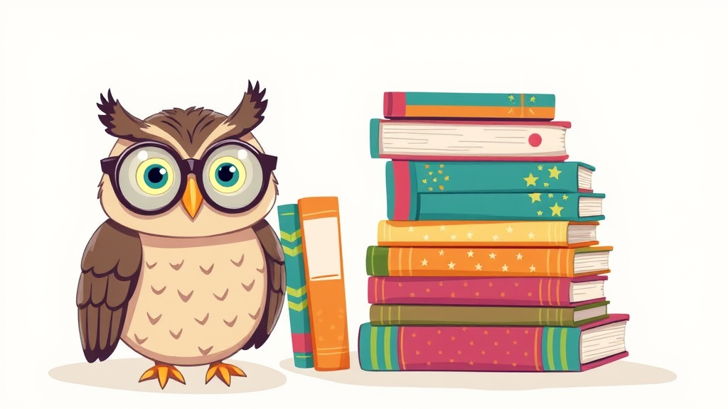 An owl with oversized round glasses perched beside an eclectic stack of colorful books, each book featuring whimsical patterns, set against a light and airy backdrop, exuding a playful and scholarly vibe in a cartoon illustration style.