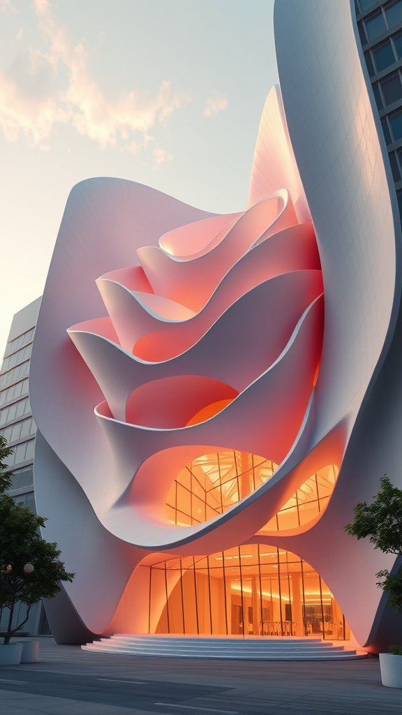 An ultra-detailed 3D architectural exterior rendering showcasing a building inspired by the intricate layers of a rose, echoing the flowing, organic forms of Zaha Hadid. Created using Unreal Engine 5 with ray tracing, post-processing, and enhanced with ZBrush and Substance Painter, this visualization features trending cinematic lighting and composition with the rule of thirds in mind. It captures low contrast, natural lighting with a realistic light fogadding atmospheric depth, offering a hyperrealistic quality with volumetric light that embodies an ultra-photoreal finish. The render uses cutting-edge techniques like corona, octane, and redshift in 8k resolution. The design, akin to a matte painting and movie concept art, creatively plays with layers on 35mm film style while incorporating subtle deviations to create a unique interpretation within this sophisticated architectural theme.