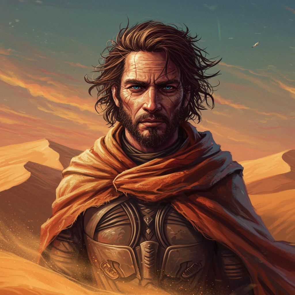 An ultra-detailed and mesmerizing portrait of a rugged male character inspired by Dune, exuding a blend of mystique and strength. The artwork, centered and intricate, captures the essence of his windswept hair and piercing eyes. Drawing inspiration from the styles of Conrad Roset, Greg Rutkowski, and Makoto Shinkai, the painting features a vivid play of colors with a psychedelic twist, enhancing the fantastical elements of the desert backdrop. The textures are rich and lifelike, giving a realistic yet cinematic feel. Emphasizing a sense of movement, the character's cloak billows dramatically, echoing the swirling sands around him. This piece, trending on ArtStation, carries subtle creative modifications that add depth without straying from the core concept, making it a striking fusion of artistry and imagination.