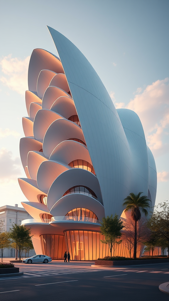 An ultra-detailed architectural exterior 3D rendering showcasing a building inspired by the layered structure of a rose flower in the style of Zaha Hadid, created using Unreal Engine 5 with advanced raytracing and cinematic post-processing techniques. The scene incorporates ZBrush modeling and Substance Painter texturing, making it a trending feature on ArtStation. It features cinematic composition adhering to the rule of thirds, with natural, low-contrast lighting enhanced by a realistic light fog to create a hyperrealistic atmosphere. Volumetric lighting and photoreal rendering techniques such as Corona Render, Octane Render, and Redshift Render are utilized to achieve an 8k resolution, 35mm cinematic look. The render emphasizes a movie concept art feel with ultra-photorealistic and hyper-detailed elements, grounded in a matte painting style to capture an intensely detailed visual narrative.