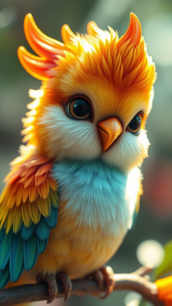 An ultra-detailed close-up of an adorable fantasy bird with a sense of innocence and playfulness, set in an enchanting scene with fairy lighting. Its vibrant feathers shimmer in bright, kaleidoscopic colors as rays of light create a soft, volumetric glow around it. The photorealistic details capture every fine texture and hue, enhanced by hdr effects that bring the whimsical creature to life in an ethereal, magical setting.