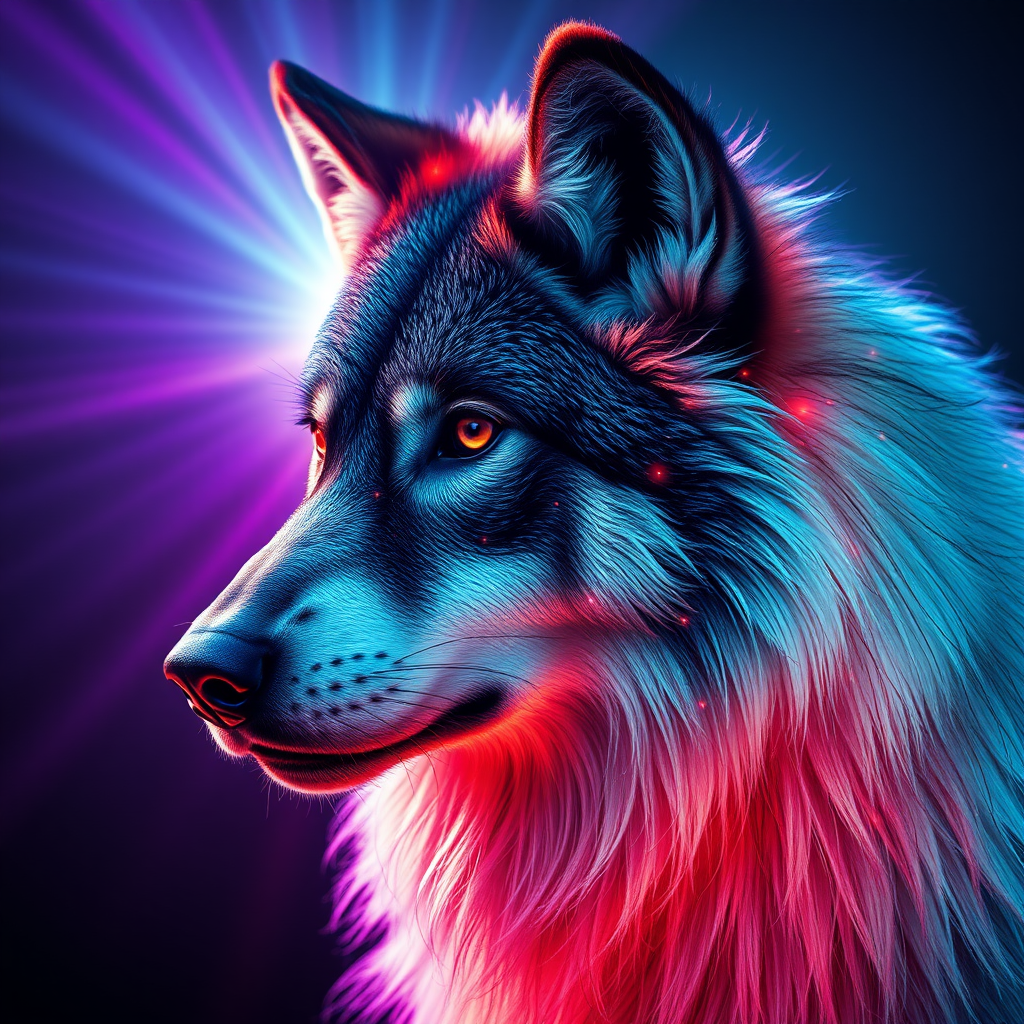 An ultra-detailed, close-up portrait of a wolf crafted from vivid neon rays, illuminated by ethereal fairy lighting. The image bursts with photorealistic, bright colors, enhanced by volumetric rays of light, giving it a mesmerizing, high dynamic range effect. The composition is set in a striking vertical aspect ratio, capturing the majestic allure of this magnificent creature.
