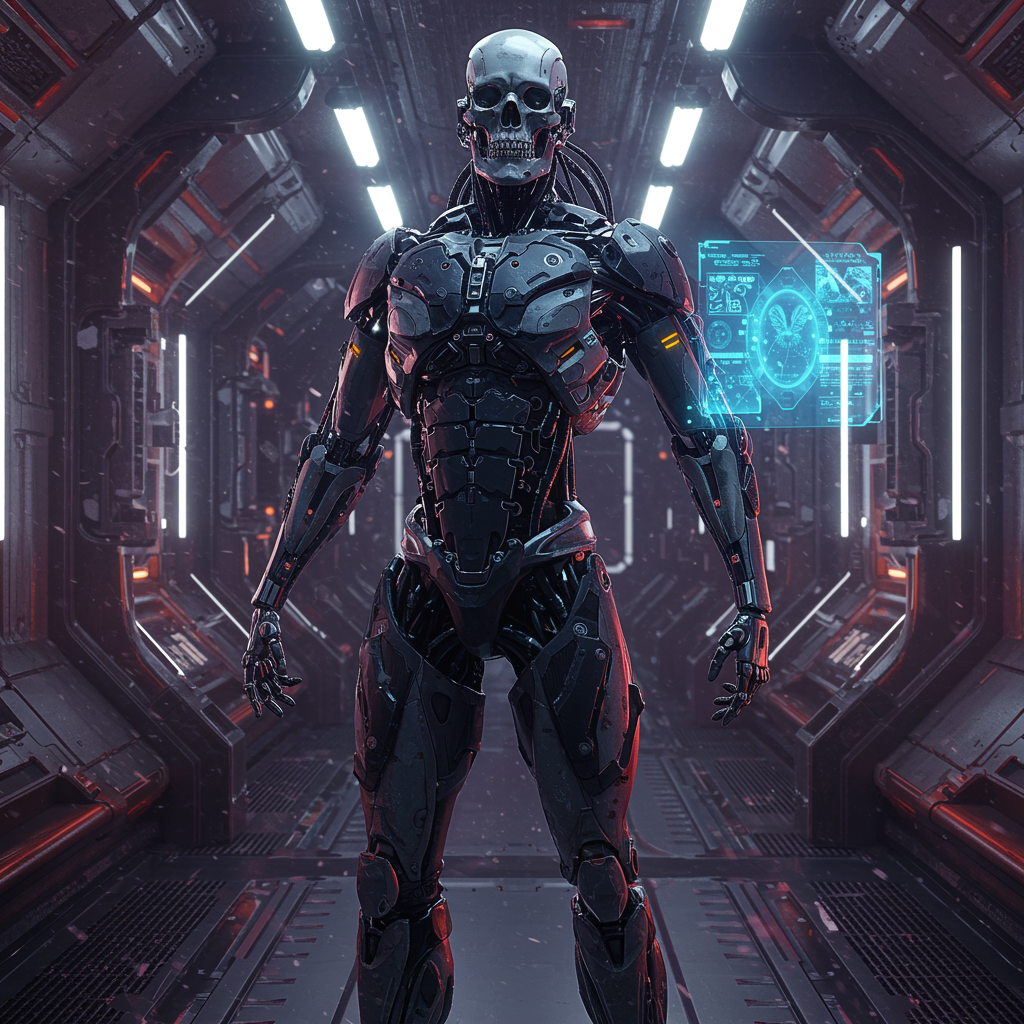 An ultra-detailed cyborg aboard a futuristic spaceship, showcasing anthropomorphic cybernetic skeleton features within its sleek metal armor. The scene is filled with vibrant neon light reflections, complex reflection mapping, and a design rich in intricacy and minute details. The dramatic lighting enhances the hyperrealism and photorealism of the setting, giving it a cinematic quality, rendered in stunning 8k resolution with an aspect ratio of 9:16. Subtle modifications include the inclusion of translucent panels on the armor, hinting at intricate circuitry beneath, and adding a holographic display projected from the cyborg's arm, providing a touch of advanced technology to the scene.