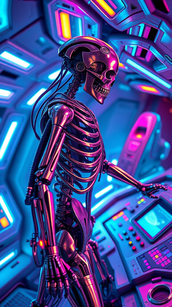 An ultra-detailed cyborg navigates the control deck of an advanced spaceship, featuring anthropomorphic cybernetic skeletal elements intricately intertwined with sleek metal armor. Neon lights cascade over the surfaces, casting vibrant reflections against the polished exoskeleton. The design is masterfully intricate, with every component meticulously detailed, showcasing a fusion of human and machine. Dramatic lighting accentuates the hyperrealistic textures, invoking a photorealistic and cinematic atmosphere. The scene embodies a heightened sense of realism, captured in glorious 8k resolution, offering a breathtaking view into a futuristic world.