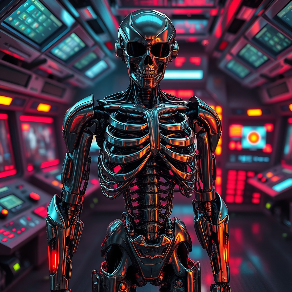An ultra-detailed cyborg stands in the control room of a futuristic spaceship, showcasing a breathtaking blend of anthropomorphic cybernetic skeleton elements seamlessly integrated into its sleek, metallic armor. The armor glistens with neon light reflections, gracefully cast from the vibrant control panels surrounding the cyborg. A complex interplay of reflection mapping reveals every intricate design and mechanical detail, highlighting the craftsmanship of its construction. Dramatic lighting enhances the hyperrealistic, photorealistic aesthetics, casting deep shadows and luminous highlights across the scene. The setting evokes a cinematic atmosphere, captured in stunning 8k resolution, presenting an awe-inspiring vision of advanced technology and design amidst the vastness of space.