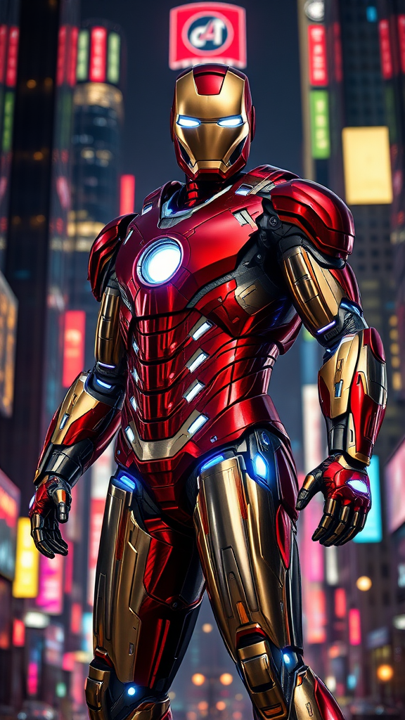 An ultra-detailed Iron Man character stands confidently in a dynamic pose, illuminated by the vibrant glow of a futuristic cyberpunk-style city at night. The background bursts with neon signs and towering skyscrapers, casting a kaleidoscope of fluorescent lights. His luxury armored suit gleams in astonishing photorealism, featuring intricate chrome details intertwined with vibrant red, electric blue, and shimmering gold accents. Each curvature of the suit reflects the city’s luminous ambiance, enhancing the scene’s otherworldly allure. His eyes and arc reactor pulse with an intense light, contrasting with the dark urban landscape, embodying a fusion of cutting-edge technology and artistic elegance.