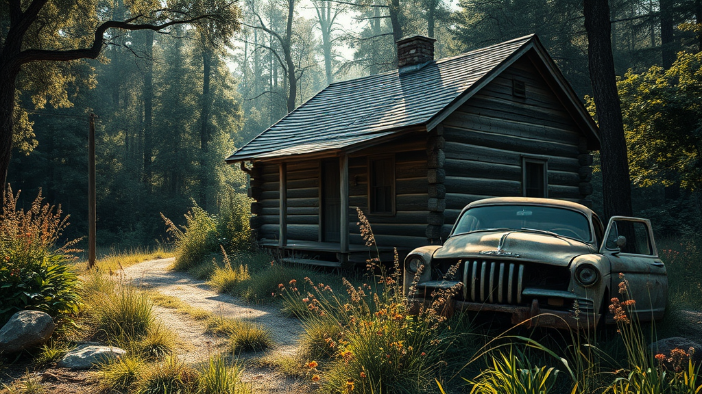 An ultra-detailed, photo-realistic image showcases an old, weathered log cabin nestled beside an overgrown dirt road. The cabin's wooden exterior is adorned with peeling paint and surrounded by wild, untamed vegetation, evoking a sense of nostalgia and history. Beside the cabin, a rusty, broken-down car reminiscent of the 1960s sits idle, its once vibrant color now faded by time. The front yard is a tangled mass of wildflowers and tall grasses, reclaiming the space once tended. Soft, dramatic light filters through gaps in the canopy of trees, casting long shadows that dance across the scene, adding depth and mystery. Every element is captured in perfect detail, from the texture of the cabin's logs to the intricate rust patterns on the car, creating a hauntingly beautiful yet melancholic tableau that invites the viewer to imagine stories of the past.
