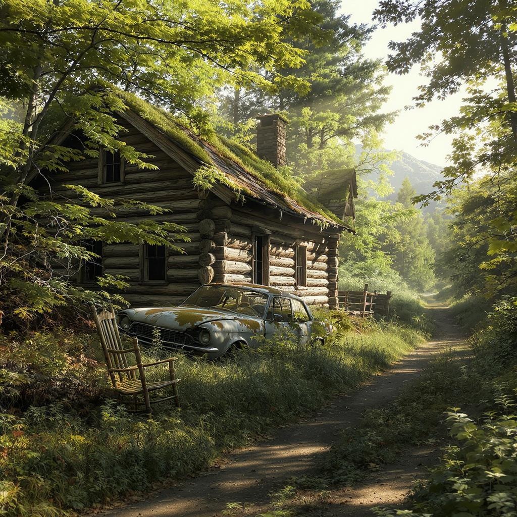 An ultra-detailed, photo-realistic scene of an abandoned log cabin sits alongside an overgrown dirt road, surrounded by a dense tangle of wild flora. The logs of the cabin are weathered and gray, with patches of moss clinging to their surfaces. A rust-covered, broken-down car from the 1960s leans against the cabin, its windows shattered and its color faded to a dull, sun-bleached hue. The front yard is an unruly sea of tall grass and weeds, nearly swallowing an old rocking chair that creaks gently in the breeze. Sunlight filters through a canopy of trees, casting dramatic patterns of light and shadow across the scene, enhancing the sense of isolation and forgotten history. Lush foliage encroaches from all sides, enveloping the scene in a volumetric embrace that tells a story of nature reclaiming its space, while a distant mountain range looms softly in the backdrop, adding depth and mystique to the landscape.