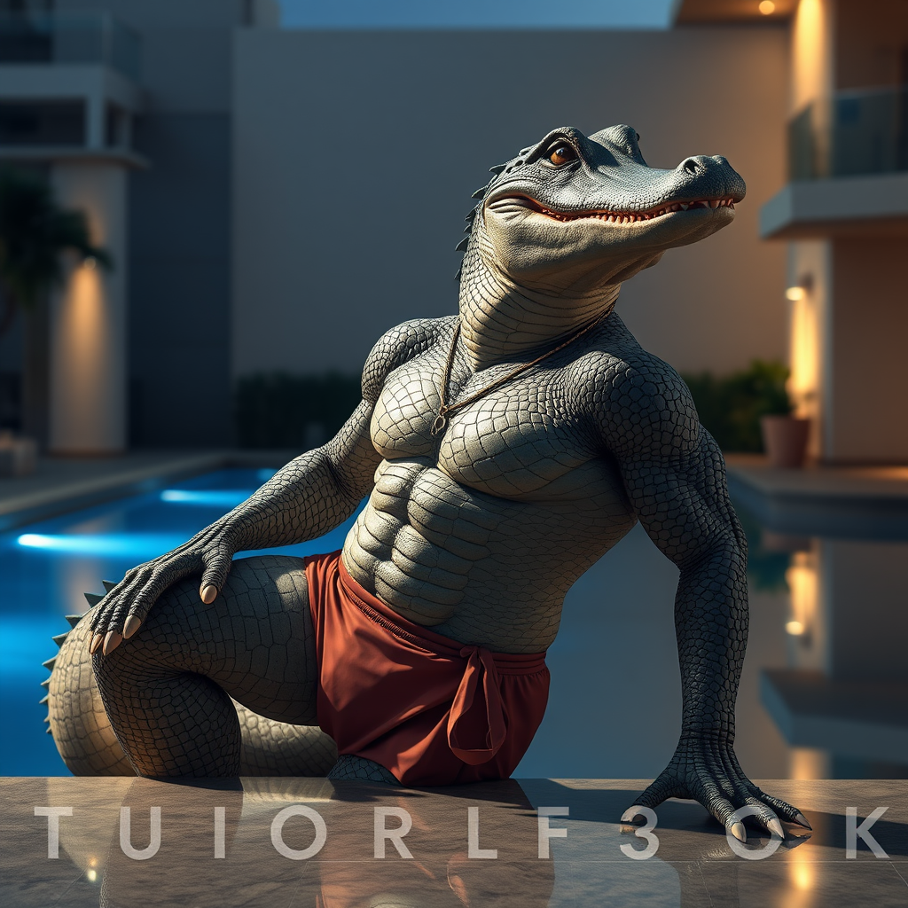 An ultra-detailed photograph of a magnificent anthropomorphic crocodile with a sleek, athletic build and modern masculine charm, donning stylish swimming attire and striking a confident pose by a luxurious pool. The composition captures an awe-inspiring scene, with hyper-realistic details and heightened emotional depth, all enhanced by epic cinematic lighting. Shot in 32k UHD resolution using a Hasselblad H6D 400c Multi-Shot camera paired with a Mitakon Speedmaster 35mm f/1.2 XCD lens, the image boasts an expressive style with an elongated aspect ratio of 1:2. The setting is imbued with a touch of anime-inspired artistry, achieving a vibrant and dynamic niji 5 aesthetic. Despite the serene surroundings, an underlying sense of raw power and elegance emanates from the character, creating an unforgettable visual experience.