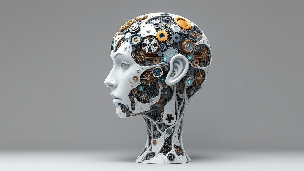 An ultra-detailed, photorealistic digital concept art piece of an abstract sculpture depicting a head and neck in slight profile. The surface features intricate patterns of interconnected gears and mechanical elements, merging organic and technological aesthetics. The sculpture's colors are a muted palette of whites, blacks, browns, blues, gold, and silver. Set against a light gray background with diffused lighting, the piece has a serene atmosphere and lacks any visible shadows or stand. Subtle artistic modifications include additional swirling patterns reminiscent of circuitry and hints of luminescent blue running through the design, suggesting a seamless integration of life and mechanics.
