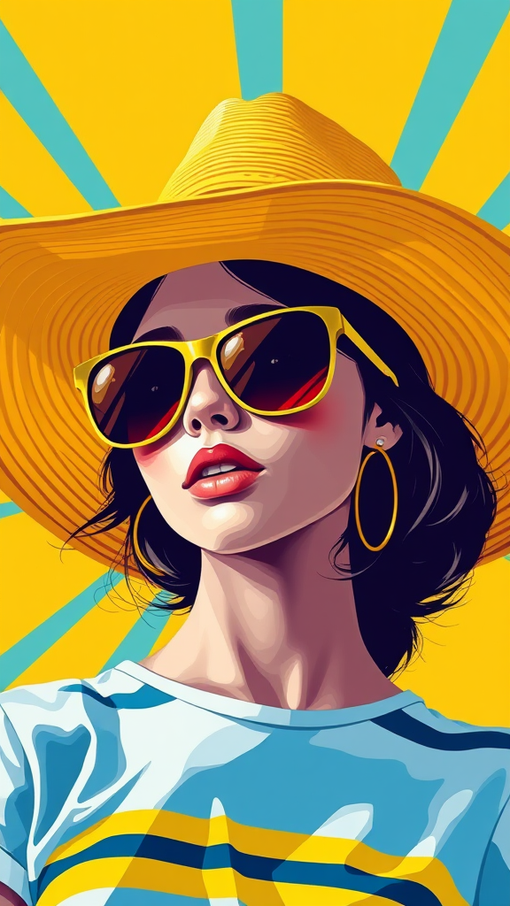An ultra HD illustration of a girl wearing oversized sunglasses and a wide-brimmed hat, embodying a bold and colorful graphic design in the style of Mike Deodato. The composition is dominated by vibrant hues of yellow and azure, with dynamic striped patterns adding depth and movement. The scene captures a lively, modern aesthetic from 1970 to the present, offering a playful and artistic interpretation with a slightly abstract twist, suitable for a portfolio showcase.