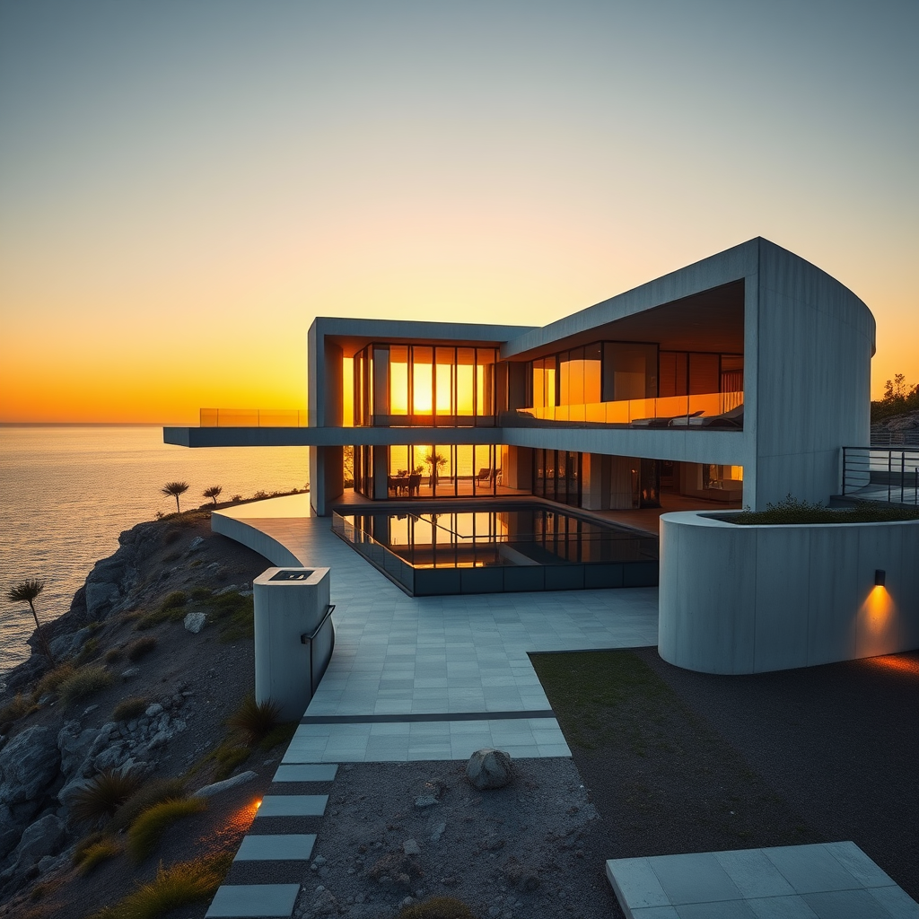 An ultra-high-definition image of a stunning modern house at golden hour, featuring sleek concrete edges and expansive glass walls that reflect the warm sunlight. The 21st-century architectural style is highlighted by the interplay of solid and transparent elements, creating a harmonious balance. Situated by a serene, expansive sea, the water mirrors the vibrant hues of the sky. The surrounding landscape complements the house's design with minimalist landscaping and subtle, elegant outdoor lighting that begins to glow as the sun dips below the horizon.