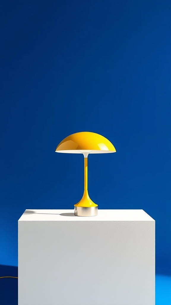 An ultra-high-definition, photorealistic image depicting a front view of a sleek, reflective yellow Louis Poulsen Panthella 250 table lamp positioned on a pristine 45-degree white square box within a professional photo studio setting. Captured with a Nikon D850 using a Nikon AF-S Micro-Nikkor 60mm f/2.8G ED lens, the camera is configured to an aperture of f/8 and ISO 100. The composition features a deep blue solid color background that contrasts vividly with the lamp, highlighted by precise studio lighting that simulates natural sunlight. The setup includes a square soft box providing optimal illumination, enhancing the lamp's contours and reflective surfaces while maintaining the minimalistic and elegant aesthetics of the scene. There are no distortions, extraneous elements, or unnecessary details, ensuring a seamless, clean, and striking image.