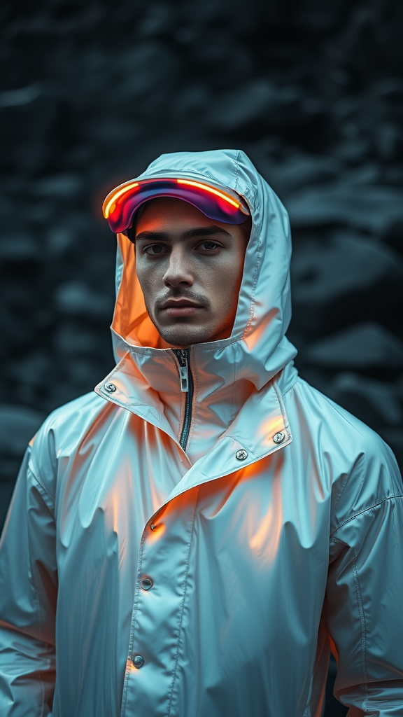 An ultra high definition professional high fashion studio portrait of a male model showcasing a luminous pearlescent raincoat with subtle opalescent hues, complemented by a sleek neon visor. Positioned in an Icelandic black rock setting at the break of dawn, the atmosphere is captured with extreme detail and clarity. The image emphasizes a stark contrast between the model and the rugged landscape, featuring intricate refraction and a shallow depth of field. Volumetric lighting enhances the scene, with delicate interplay of light and shadow enhanced by ray tracing effects illuminating the model with ethereal light rays. The setting conveys an air of mystique and otherworldly charm, embodying the quintessence of high fashion in harmony with nature's raw elements.