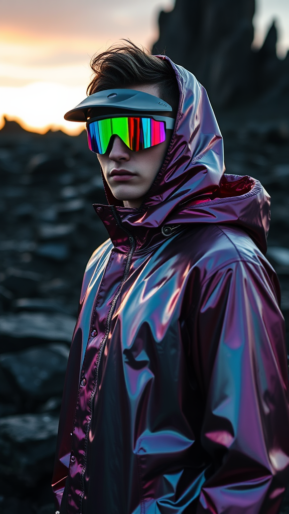An ultra high definition professional high fashion portrait studio full length photograph of a male model wearing a futuristic, iridescent raincoat and neon visor, set against an Icelandic black rock landscape at dawn. The environment is stark, with intricate details and dynamic refraction. The use of shallow depth of field highlights the model, while ethereal volumetric light and shadow interplay across the scene. Skillful ray tracing accentuates the light rays streaming through the visor and raincoat, casting abstract reflections on the rocks. Atmospheric and cinematic, the image captures the essence of avant-garde fashion in a raw, elemental setting.