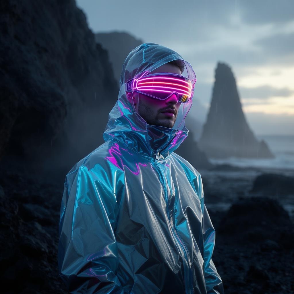 An ultra high definition studio photograph of a male model in a transparent iridescent raincoat and neon visor, set in a dramatic Icelandic black rock landscape at dawn. The image captures meticulous details with stark contrasts, showcasing refraction and shallow depth of field. Volumetric light and shadow interplay, enhanced by ray tracing, highlight the ethereal atmosphere with beams of light cutting through the early morning mist. The environment is a stunning blend of natural beauty and futuristic fashion, devoid of any jewelry, text, or artifacts, and focused solely on the model and the breathtaking setting.