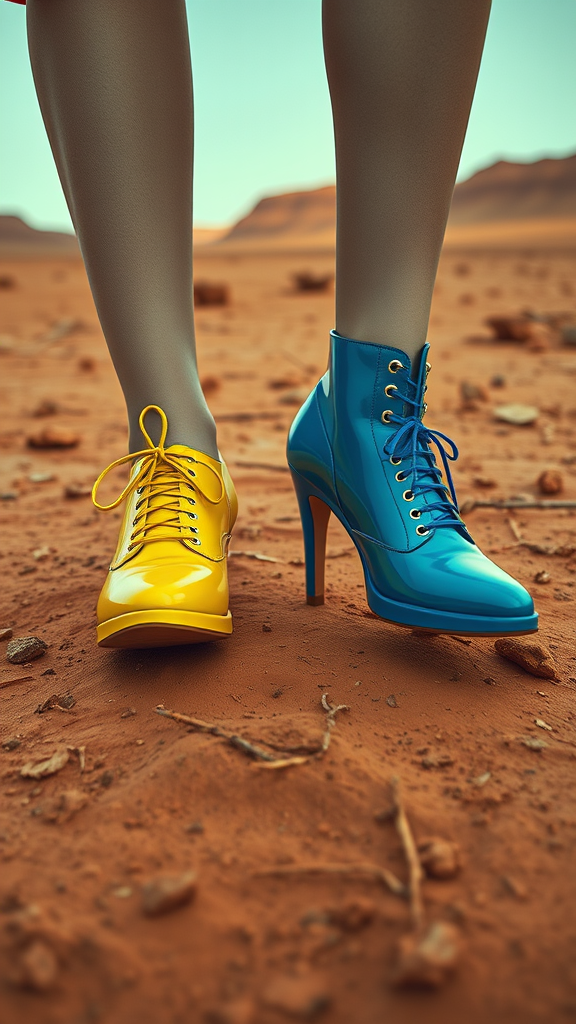 An ultra-high-resolution fashion shoot featuring two pairs of vibrant yellow and deep blue shoes adorning the feet of models amidst a surreal Martian landscape, captured with professional photography techniques to highlight the brand's elegance; photorealistic detail with stunning clarity, showcasing the shoes in breathtaking 8k resolution, with an aspect ratio of 4:5, emphasizing the striking color contrast against the stark and otherworldly red terrain of Mars.