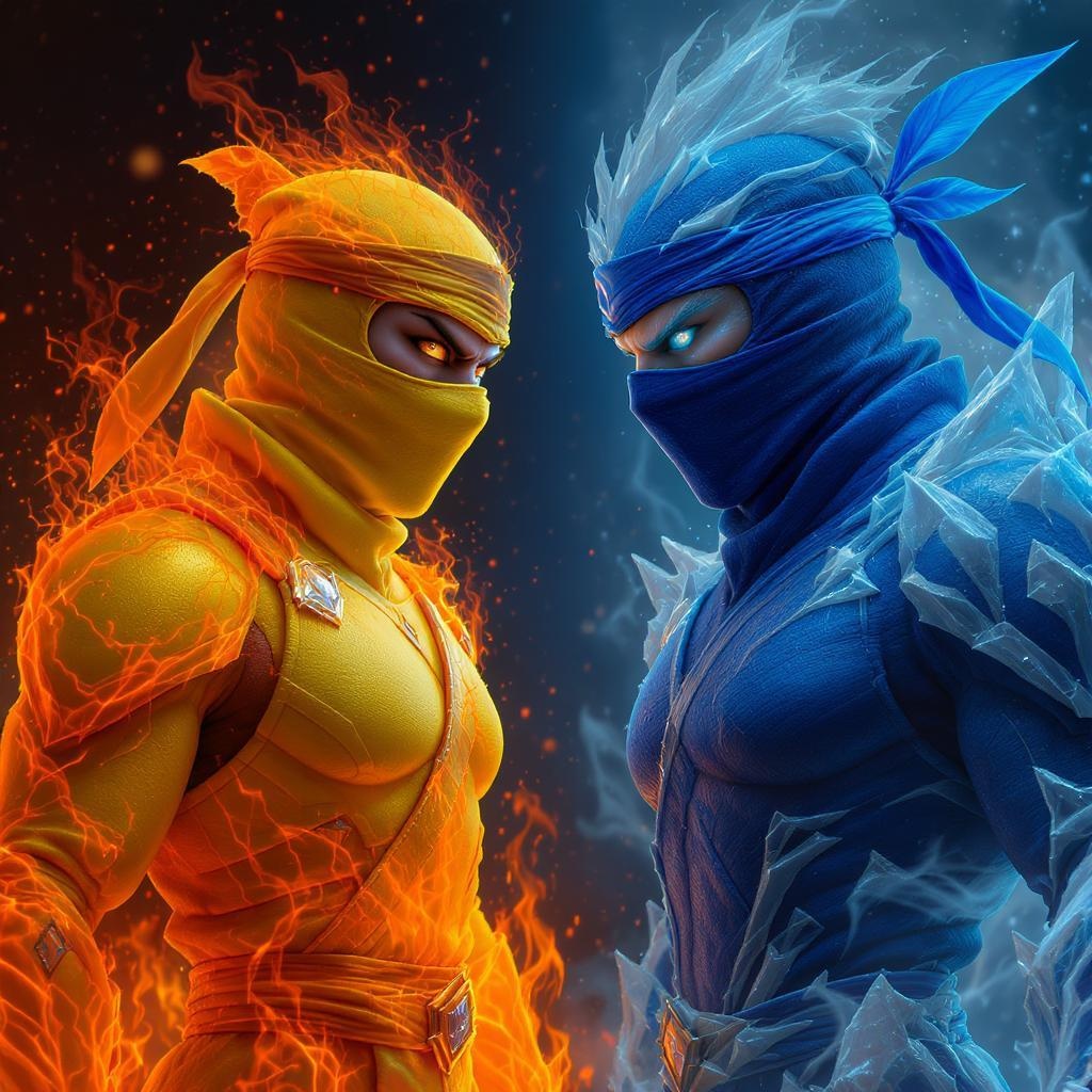 An ultra-realistic 3D render of two ninjas in contrasting styles: one in vibrant yellow, embodying the essence of fire with flames subtly dancing across their attire, their eyes reflecting a fierce determination. The other ninja is clad in a deep blue, epitomizing the chill of ice, with their garments shimmering like frozen crystals, their gaze as cold and calculating as the icy realm they represent. Incorporating elements of gold and diamond embellishments on their suits, they stand in dynamic poses, showcasing a harmonious yet intense balance between fire and ice in an epic, cinematic confrontation.