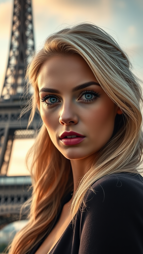 An ultra-realistic 4k cinematic masterpiece capturing a stunning blonde woman with striking features, set against the iconic backdrop of the Eiffel Tower, showcasing extreme attention to detail and vivid colors, creating a harmonious blend of beauty and architectural elegance.