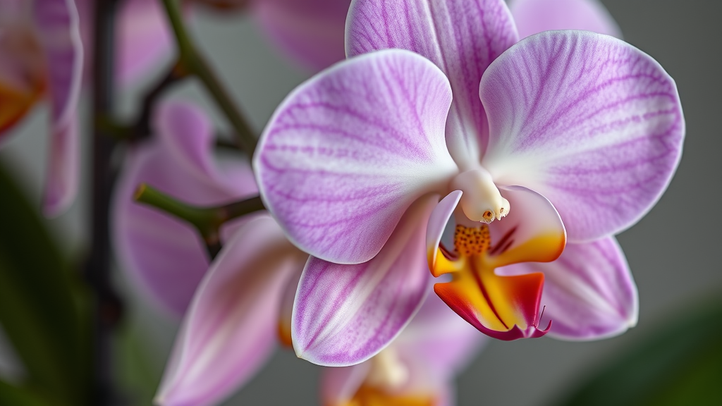 An ultra-realistic close-up of a blooming orchid, showcasing intricate textures and vibrant colors, captured in the style of nature photography with a Sony A7 III camera. The composition emphasizes the delicate petals and rich greens of the leaves, set against a softly blurred background to highlight the flower's details. The image is in an aspect ratio of 1:2, offering a tall and elegant perspective, with a slightly dreamy and artistic flair introduced through a subtle stylization effect.