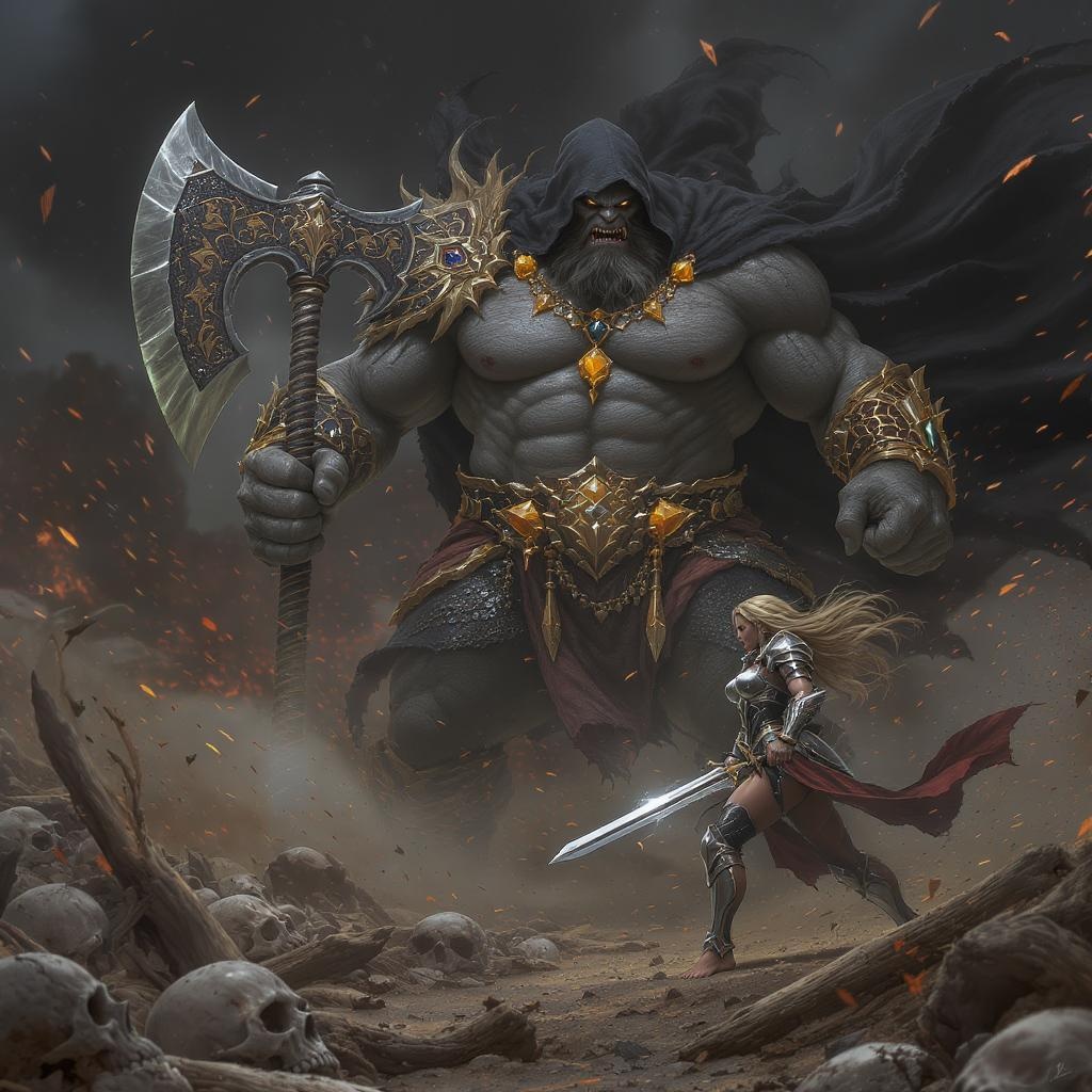 An ultra-realistic depiction of a DND character unfolds as a hooded giant ogre strides forward, gripping a massive, cursed axe. His path is strewn with the remnants of crushed skeletons, while his arms are adorned with golden, ornamented bracelets, and his waist is cinched with a jeweled belt. Necklaces hang from his neck, their gemstones glinting ominously. Opposite him, a diminutive but fierce female warrior stands barefoot, her full armor gleaming under an unseen light. Her arms are confidently spread, clutching a sword in one hand and a dagger in the other. The scene pulses with tension, cinematic and dramatic, capturing the clash between immense power and indomitable courage. The atmosphere is charged, as swirling winds add an element of chaotic energy to this epic standoff.