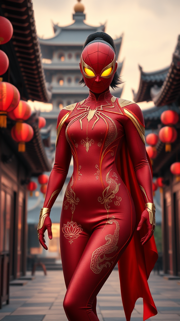 An ultra-realistic depiction of a female Spider-Woman in a full-body view, showcased in a photorealistic 8K rendering. She is dressed in a sleek, form-fitting costume, seamlessly blending the traditional elegance of a Chinese qipao with a superhero's flair. The suit features a deep crimson base adorned with intricate golden embroidery of dragons and phoenixes, gracefully merging with subtle spider-web patterns. Her high-collared neckline and elegant side slits recall the sophisticated lines of a qipao, complemented by futuristic elements such as armored sleeves and gloves. Her mask, in striking crimson, features glowing golden eyes that radiate a powerful and enigmatic aura. A regal silk cape, embellished with delicate gold lotus motifs, flows elegantly behind her, adding a dynamic sense of movement. She stands with confidence in the heart of a traditional Chinese courtyard at dusk, surrounded by the soft glow of ancient red lanterns and the majestic backdrop of pagoda-style architecture. Cherry blossom trees and a stone bridge arching over a serene pond contribute to the tranquil and majestic setting. The rain-washed ground reflects the lanterns' light, while a gentle mist swirls through the scene. Her pose is both dynamic and graceful, embodying strength and elegance. Hyper-detailed textures and lifelike proportions, enhanced by cinematic lighting, vividly capture the harmonious blend of Chinese cultural elements. Shot in natural light using a Sony A7III, in UHD resolution.