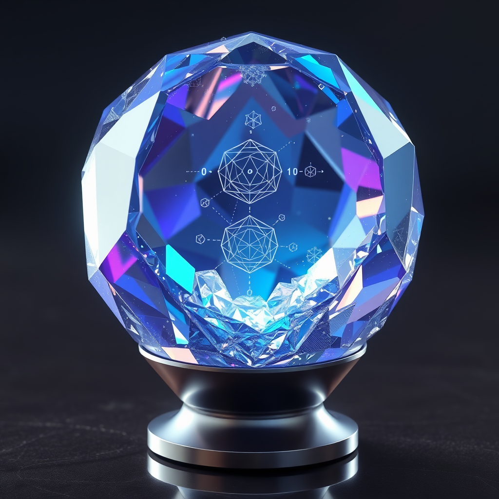 An ultra-realistic depiction of a futuristic, multifaceted crystal; its surface shimmers with iridescent colors, catching the light at different angles to reveal an interplay of vibrant blues, purples, and silvers. The crystal seems to hover above a sleek, metallic base, emitting a soft, ethereal glow that casts intricate geometric patterns on the surrounding surfaces. Within the crystal, faint holographic symbols and patterns float and swirl, suggesting advanced technology and energy beyond current capabilities. The atmosphere is serene yet charged with an enigmatic energy, capturing the essence of advanced science and natural beauty intertwined.