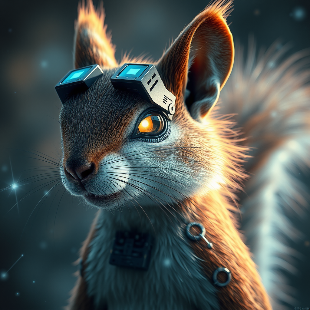 An ultra-realistic depiction of a human-like squirrel with oversized, exaggeratedly large physical features, showcasing cyberpunk-inspired glowing eyes and advanced cybernetic enhancements. The image is rendered in high detail, emphasizing intricate textures and elements with 8K resolution quality. The scene is enhanced with a holographic effect, creating a three-dimensional image where light beams interact dynamically around the figure, adding an ethereal and futuristic ambiance.