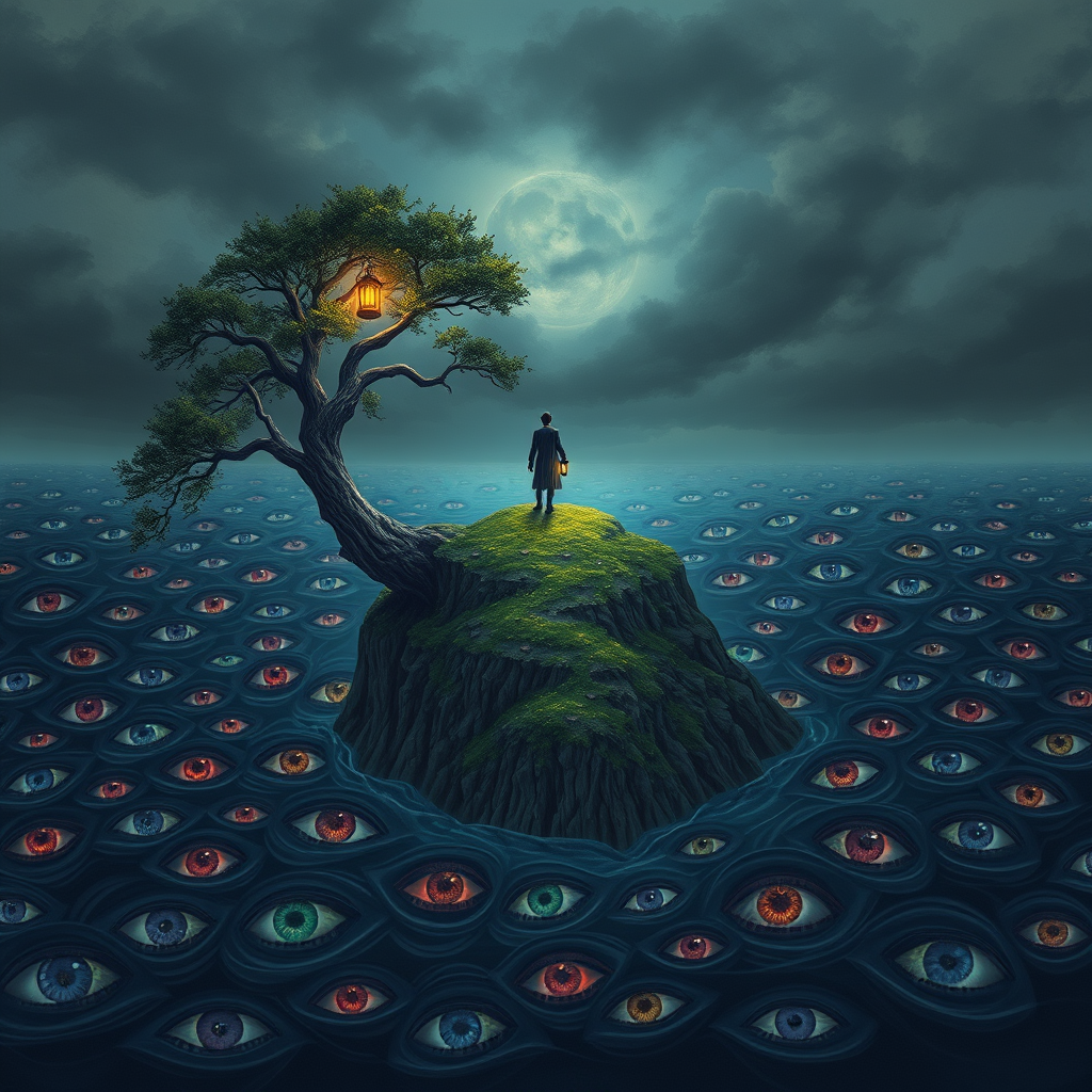 An ultra-realistic illustration depicting an island surrounded by an ocean of multicolored eyes. Perched atop a tree on this island is a mysterious figure, holding a lantern that casts a soft, ethereal glow. The scene is set under a dark, moody sky with intricate details highlighting the textures of the island and the surreal eyes in the ocean. The image captures the harmony between the natural and the fantastical elements, presenting a captivating and eerie atmosphere. The composition maintains high quality, ensuring no errors or artifacts, with every aspect precisely rendered for a lifelike effect.