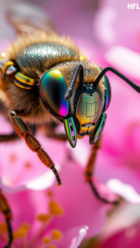 An ultra-realistic macro photo capturing a portrait of a bioengineered robotic bee, its metallic exoskeleton glistening under sunlight. The intricate details of its composite eyes reflect a spectrum of colors, while its delicate wings, a fusion of synthetic fibers and natural elements, flutter subtly. Specks of golden pollen cling to its mechanical legs and iridescent thorax, highlighting the seamless blend of nature and technology. The background features a soft blur of vibrant blossoms, enhancing the focus on the bee's sophisticated design and its role in pollination.
