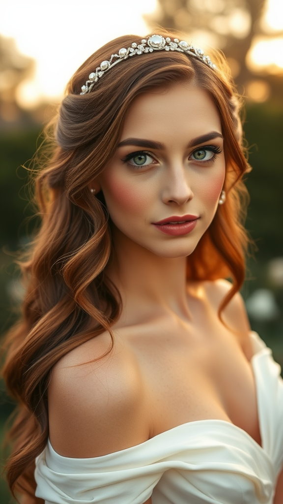 An ultra-realistic portrait of a bride with sparkling green eyes, long auburn wavy hair cascading down her shoulders, adorned with a delicate pearl tiara, captured in a serene garden setting. She's wearing an elegant off-the-shoulder ivory wedding gown that gracefully drapes around her. The soft, ethereal glow of natural light illuminates her face, which showcases intricate skin texture and soft blush hues. Shot with cinematic and volumetric lighting at golden hour, utilizing an 85mm lens to capture the essence of magic photography. The composition is incredibly detailed and photorealistic, exuding a sense of timeless romance and elegance, with beautiful bokeh in the background, highlighting the bride's enchanting allure.