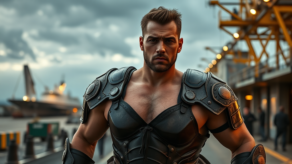 An ultrarealistic, hyper-detailed portrait photograph captures a 28-year-old Israeli Caucasian male in a full-body triangulation from head to toe. This dominant alpha male exudes strength with a sculpted, muscular physique, a hairy chest, and proportionate features. His slightly smaller head boasts shiny hair, accentuating his confident demeanor. The scene unfolds at a bustling spaceport, with a sci-fi ship launching in the backdrop, casting a cinematic atmosphere under overcast skies. The subject is clad in intricately detailed plate leather armor, evoking a sense of power and mystery. Natural and moody lighting envelops the scene, enhancing the vibrant, photorealistic textures and creating a cinematic rendering akin to a high-budget film. The vivid action pose captures movement as volumetric lighting and long exposure effects contribute to the epic narrative. Every element, from the raw natural textures to the precise details of the armor, is rendered in 8K Ultra-HD for an immersive viewing experience, drawing inspiration from the style of 'pursuit' by Gesaffelstein with a focus on unmatched visual and emotional impact.