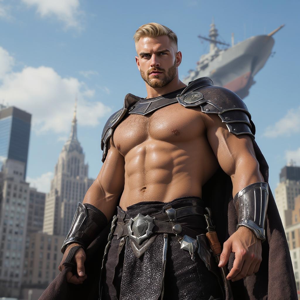 An ultrarealistic portrait photograph showcasing a full-body view of a 28-year-old Israeli Caucasian male in a dominant hero pose. He stands tall with a physique exuding strength and confidence, embodying the essence of an alpha male with chiselled muscles, a hairy chest, a sharp jawline, and a smaller head. His shiny, well-groomed hair catches the light as his pale skin contrasts with the backdrop of New York City on a sunny day. Clad in breeches and a leather uniform with tall, striking leather boots, his eyes are wide open with an intense gaze. The scene is captured with an 8K UHD cinematic quality using Hasselblad X1D - 50c, enriched with soft, natural lighting and vibrant detail. The composition reflects a moody and cinematic ambiance as a sci-fi ship ascends in the background, creating a dynamic and epic atmosphere. His attire is complemented by intricate plate leather armor with isolated detailing, set against the plate armor style seen in the work of Gesaffelstein. This hyper-realistic and richly detailed depiction embraces natural textures and lighting to achieve an immersive cinematic rendering, free from visual imperfections such as low resolution, poor anatomy, or digital artifacts.