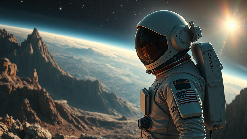 An ultrarealistic scene of an astronaut wearing a futuristic spacesuit, set in an epic fantasy world where mythical landscapes blend with the vastness of space, illuminated by epic lighting that casts dramatic shadows. The environment resembles high-definition satellite imagery, showcasing intricate details and textures, all enhanced by studio-quality light with an 8k resolution that brings out the vibrant colors and highlights. Subtle elements of a celestial phenomenon in the sky add an otherworldly touch, maintaining an atmosphere of awe and wonder.